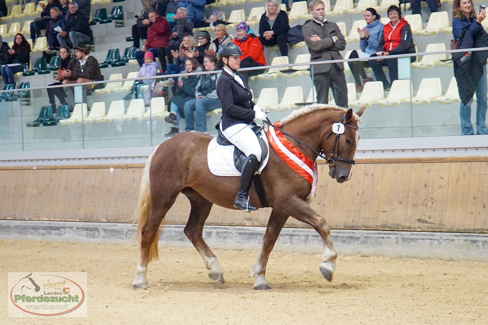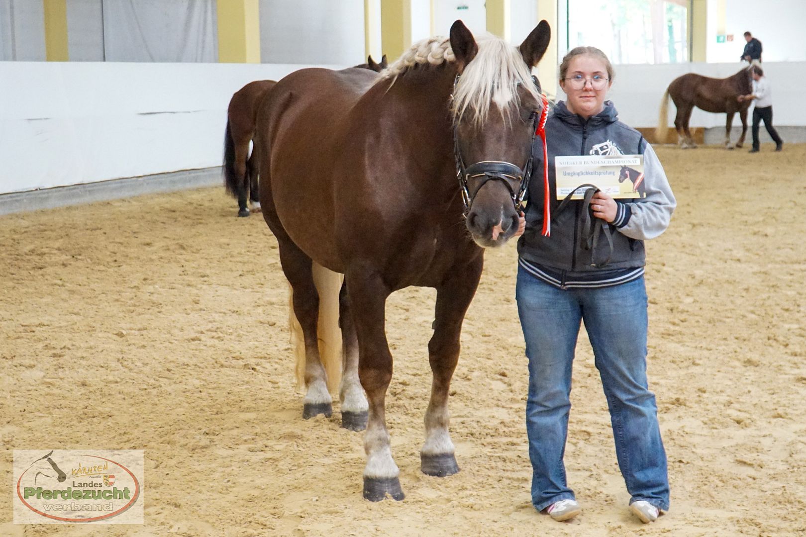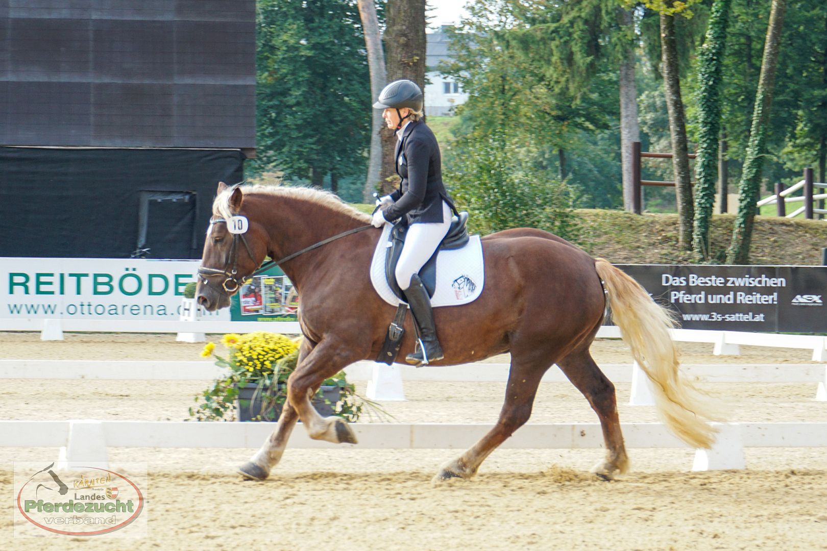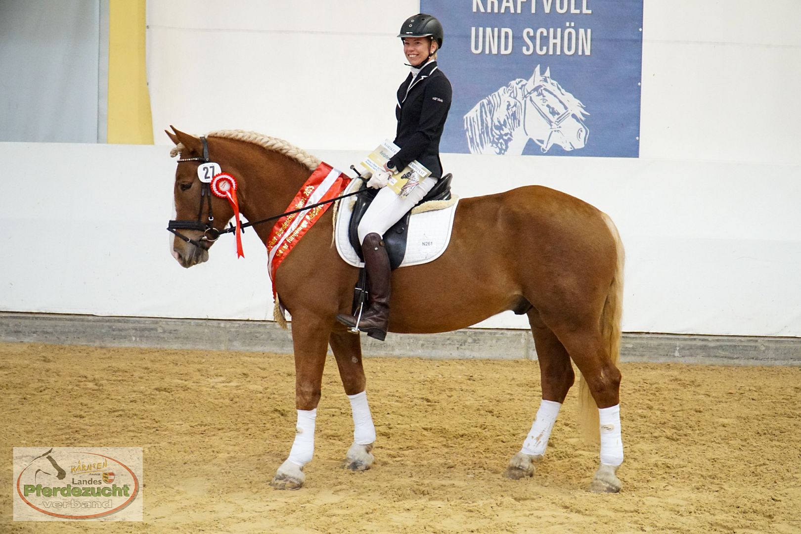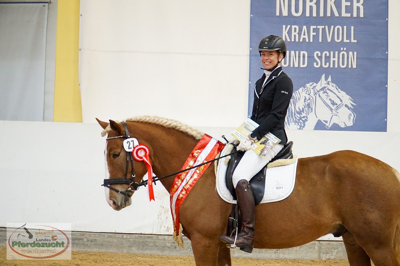 Den dritten Platz in dieser Klasse sicherte sich eine junge Stute aus Kärnten. Die Lehmfuchsstute Rabea nach Granat Diamant XVII aus der Verbandsprämienstute Ravenna nach Baron Nero XIV wurde gezüchtet und steht auch im Besitz von Silvia Gastager, Nötsch. Eindrucksvoll präsentiert wurde die rittige Stute von ihrer Tochter Alexandra Gastager. Für dieses harmonische Paar gab es nur Einzelnoten von 8,0 und mehr! Rabea präsentierte sich immer konzentriert und dafür gab es neben der 2. Bundesreservesiegerschärpe auch die gute Wertnote von 8,10.