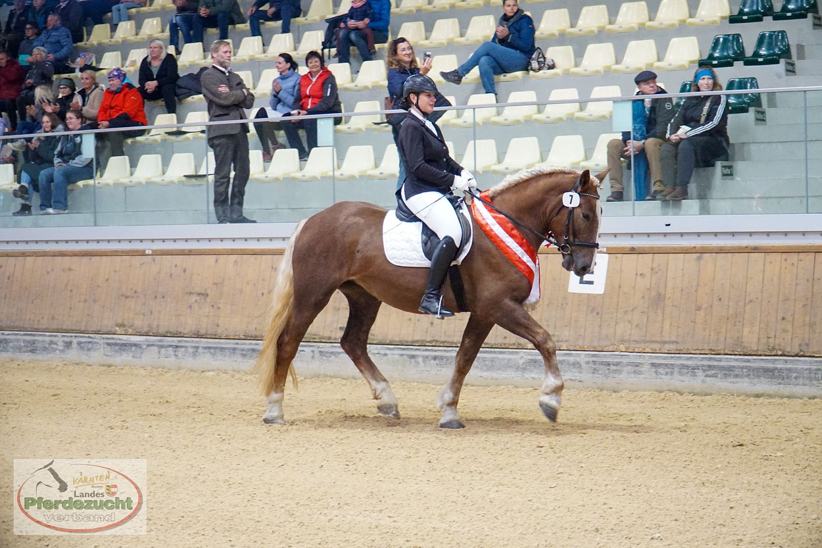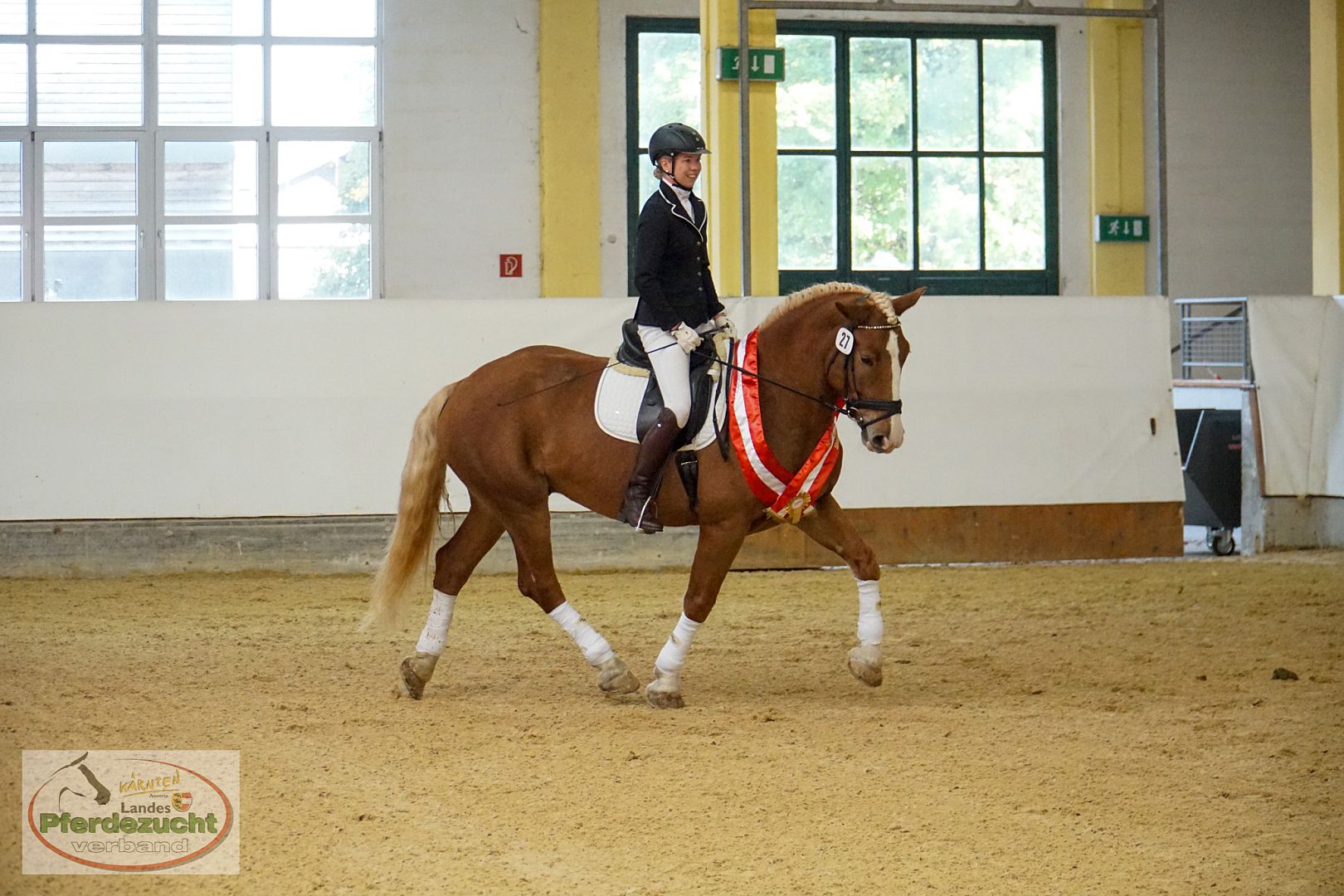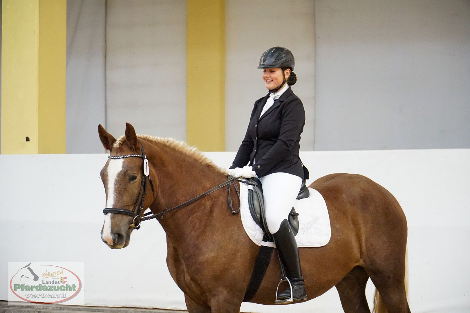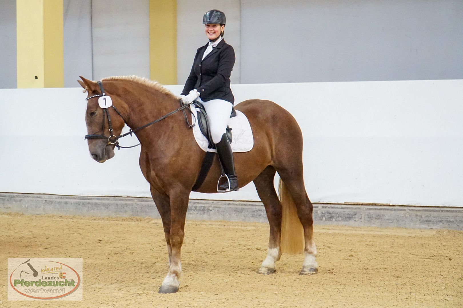 Den dritten Platz in dieser Klasse sicherte sich eine junge Stute aus Kärnten. Die Lehmfuchsstute Rabea nach Granat Diamant XVII aus der Verbandsprämienstute Ravenna nach Baron Nero XIV wurde gezüchtet und steht auch im Besitz von Silvia Gastager, Nötsch. Eindrucksvoll präsentiert wurde die rittige Stute von ihrer Tochter Alexandra Gastager. Für dieses harmonische Paar gab es nur Einzelnoten von 8,0 und mehr! Rabea präsentierte sich immer konzentriert und dafür gab es neben der 2. Bundesreservesiegerschärpe auch die gute Wertnote von 8,10.