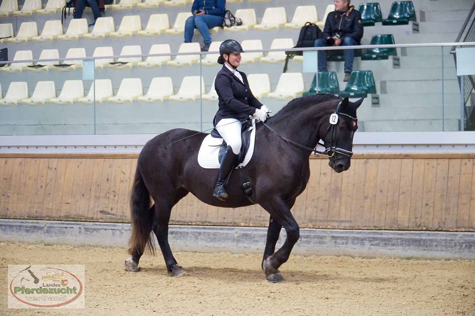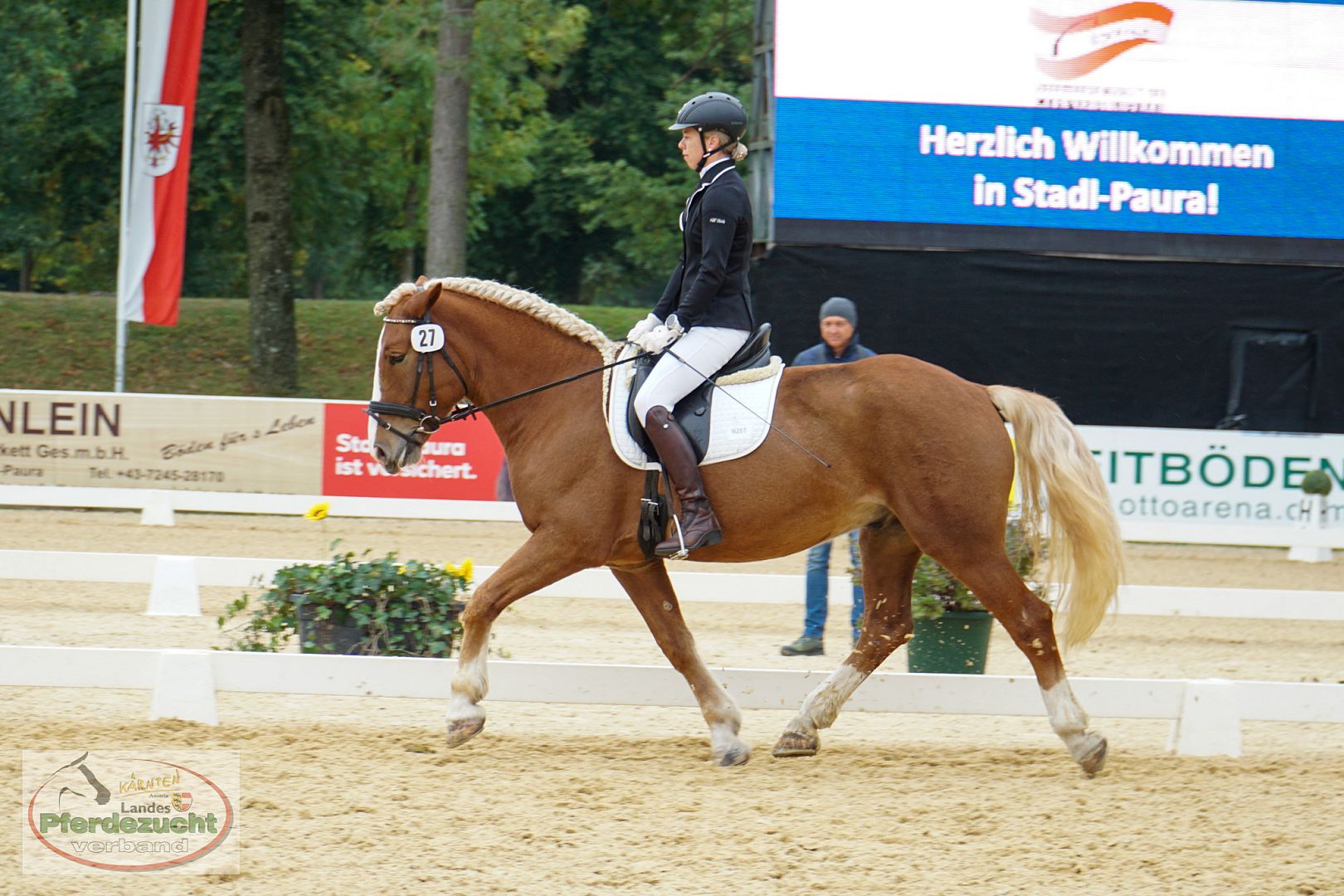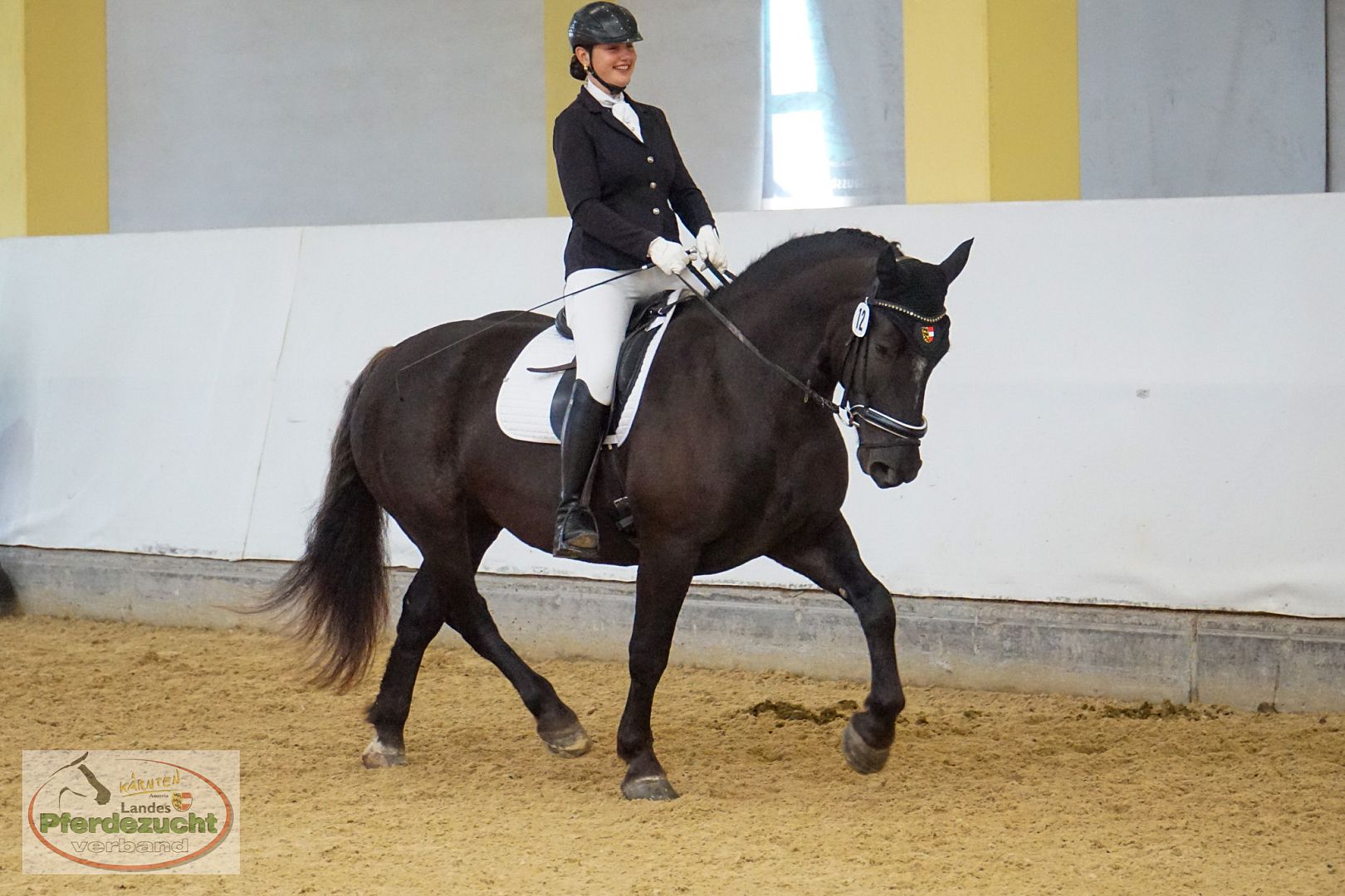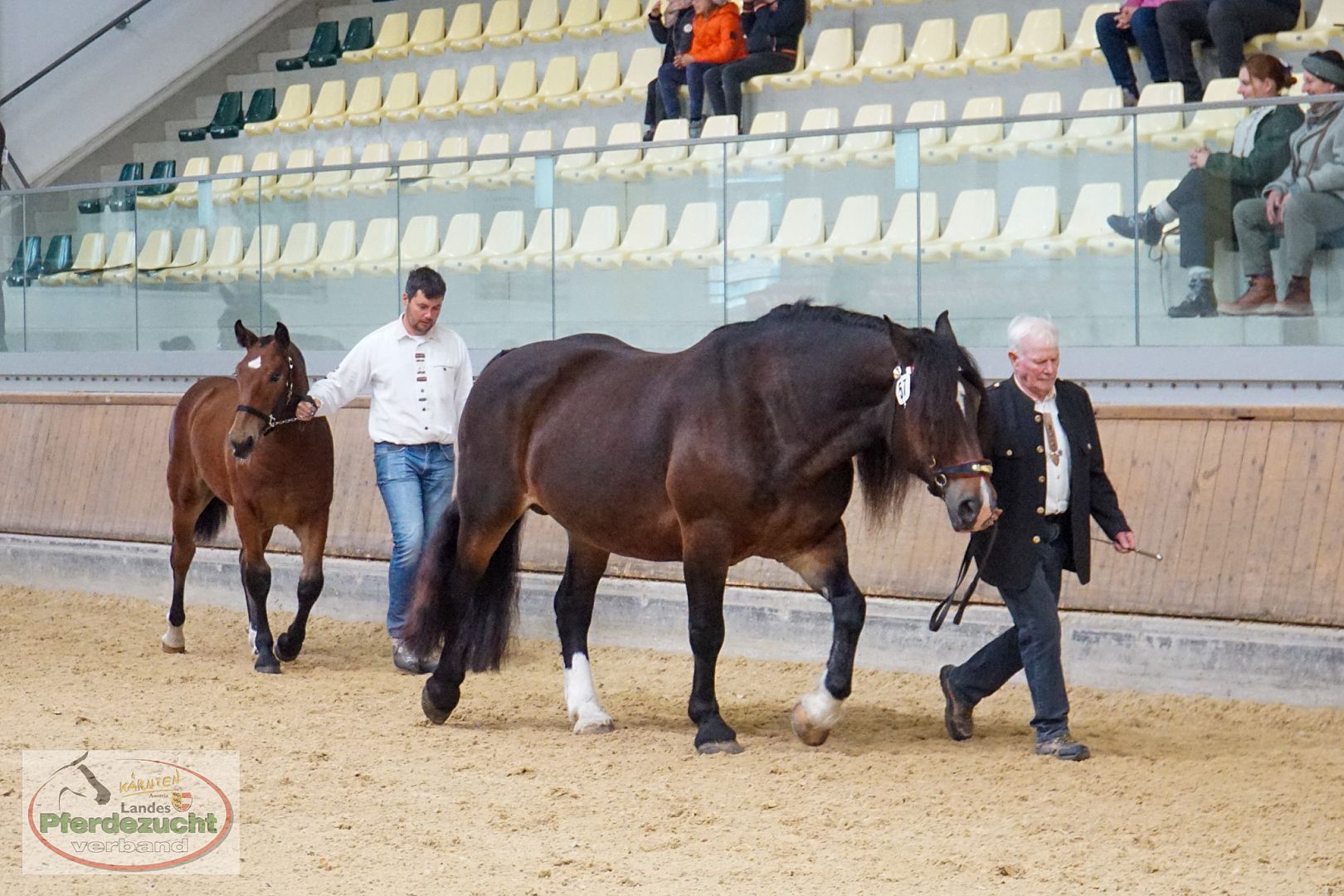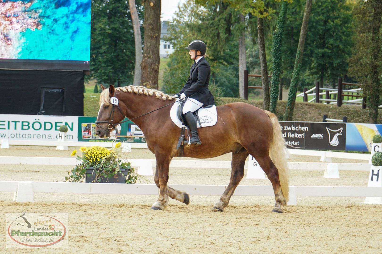 Den dritten Platz in dieser Klasse sicherte sich eine junge Stute aus Kärnten. Die Lehmfuchsstute Rabea nach Granat Diamant XVII aus der Verbandsprämienstute Ravenna nach Baron Nero XIV wurde gezüchtet und steht auch im Besitz von Silvia Gastager, Nötsch. Eindrucksvoll präsentiert wurde die rittige Stute von ihrer Tochter Alexandra Gastager. Für dieses harmonische Paar gab es nur Einzelnoten von 8,0 und mehr! Rabea präsentierte sich immer konzentriert und dafür gab es neben der 2. Bundesreservesiegerschärpe auch die gute Wertnote von 8,10.