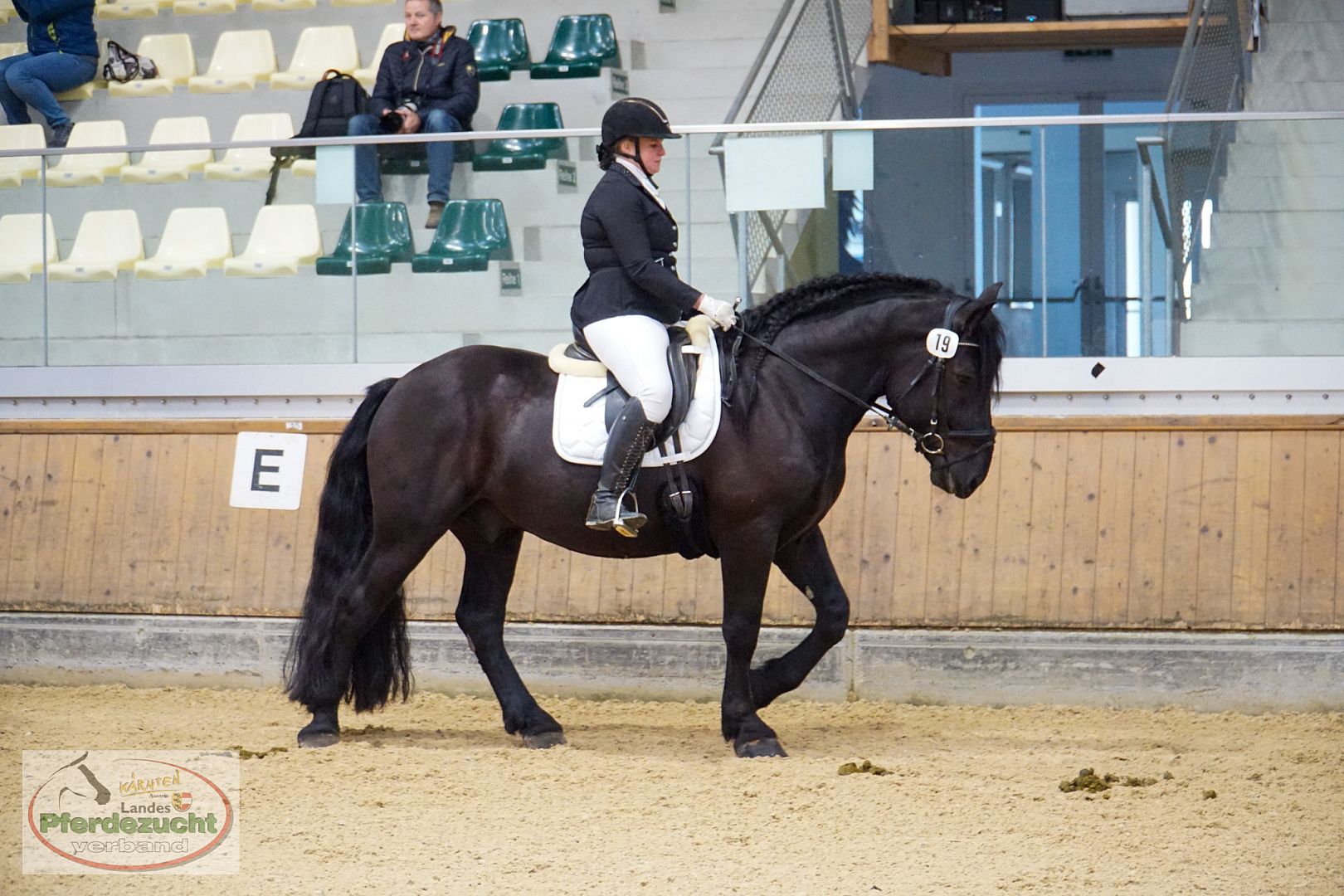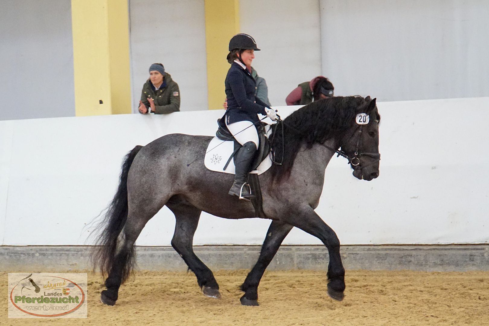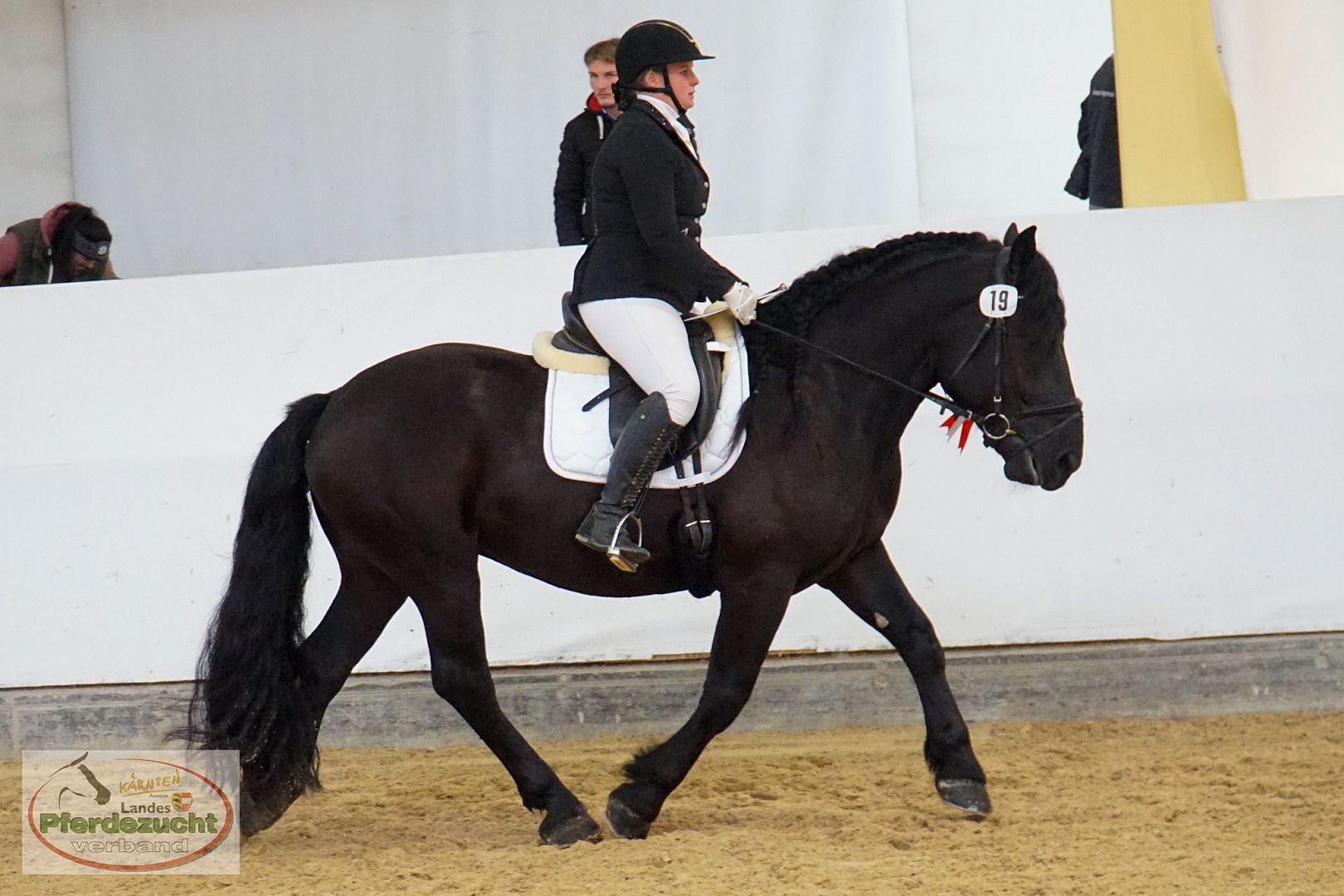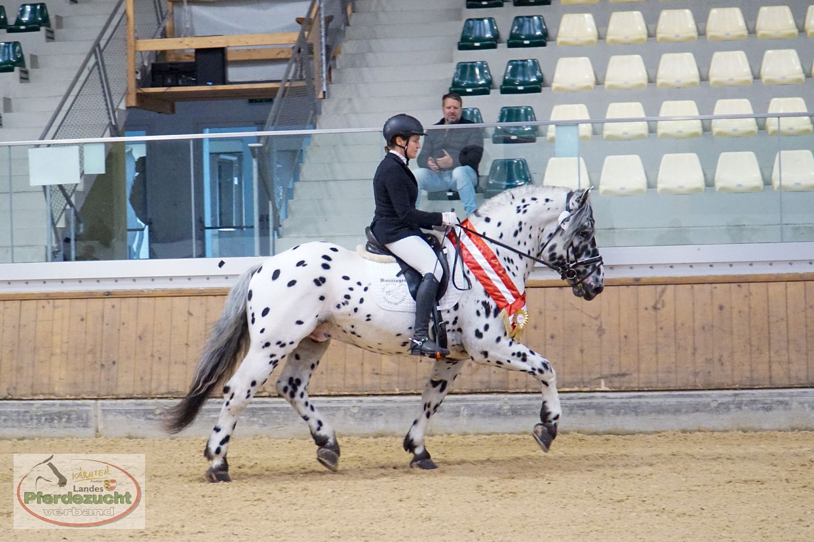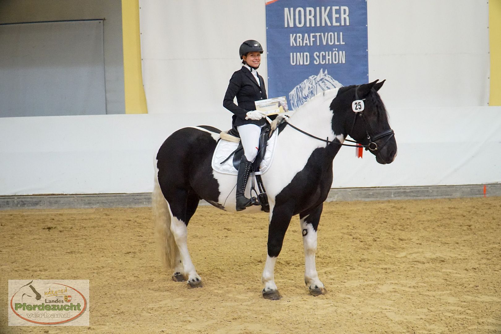 Den dritten Platz in dieser Klasse sicherte sich eine junge Stute aus Kärnten. Die Lehmfuchsstute Rabea nach Granat Diamant XVII aus der Verbandsprämienstute Ravenna nach Baron Nero XIV wurde gezüchtet und steht auch im Besitz von Silvia Gastager, Nötsch. Eindrucksvoll präsentiert wurde die rittige Stute von ihrer Tochter Alexandra Gastager. Für dieses harmonische Paar gab es nur Einzelnoten von 8,0 und mehr! Rabea präsentierte sich immer konzentriert und dafür gab es neben der 2. Bundesreservesiegerschärpe auch die gute Wertnote von 8,10.
