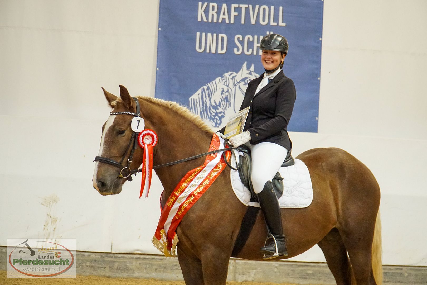 Bundessieger in dieser Klasse wird der Dunkelfuchswallach Zandoro Schaunitz XVII nach Zlan Schaunitz XVI aus der Verbandsprämienstute Ravenna nach Baron Nero XIV – somit ein Halbbruder zu der zuvor beschriebenen 2. Bundesreservesiegerin bei den Dreijährigen Rabea! Gezüchtet wurde dieser bewegungsstarke Wallach also ebenfalls von Silvia Gastager in Nötsch. Perfekt vorgestellt wurde Zandoro von seiner jetzigen Besitzerin und Reiterin Jennifer Kandutsch, Thörl-Maglern. Dieses Duo überzeugte auf ganzer Linie und neben sehr guten Noten in allen Einzelkriterien wurde vor allem der taktsichere, raumgreifende und überragende Schritt dieses Jungpferdes vom Richterkollegium sehr gelobt. Die stolze Besitzerin freut sich über die hervorragende Wertnote von 8,30 und natürlich über die rot-weiß-rote Schärpe.