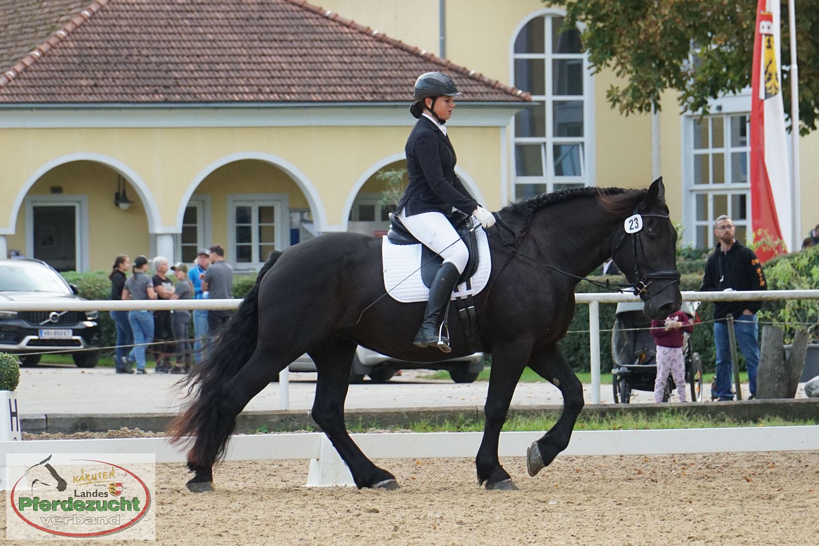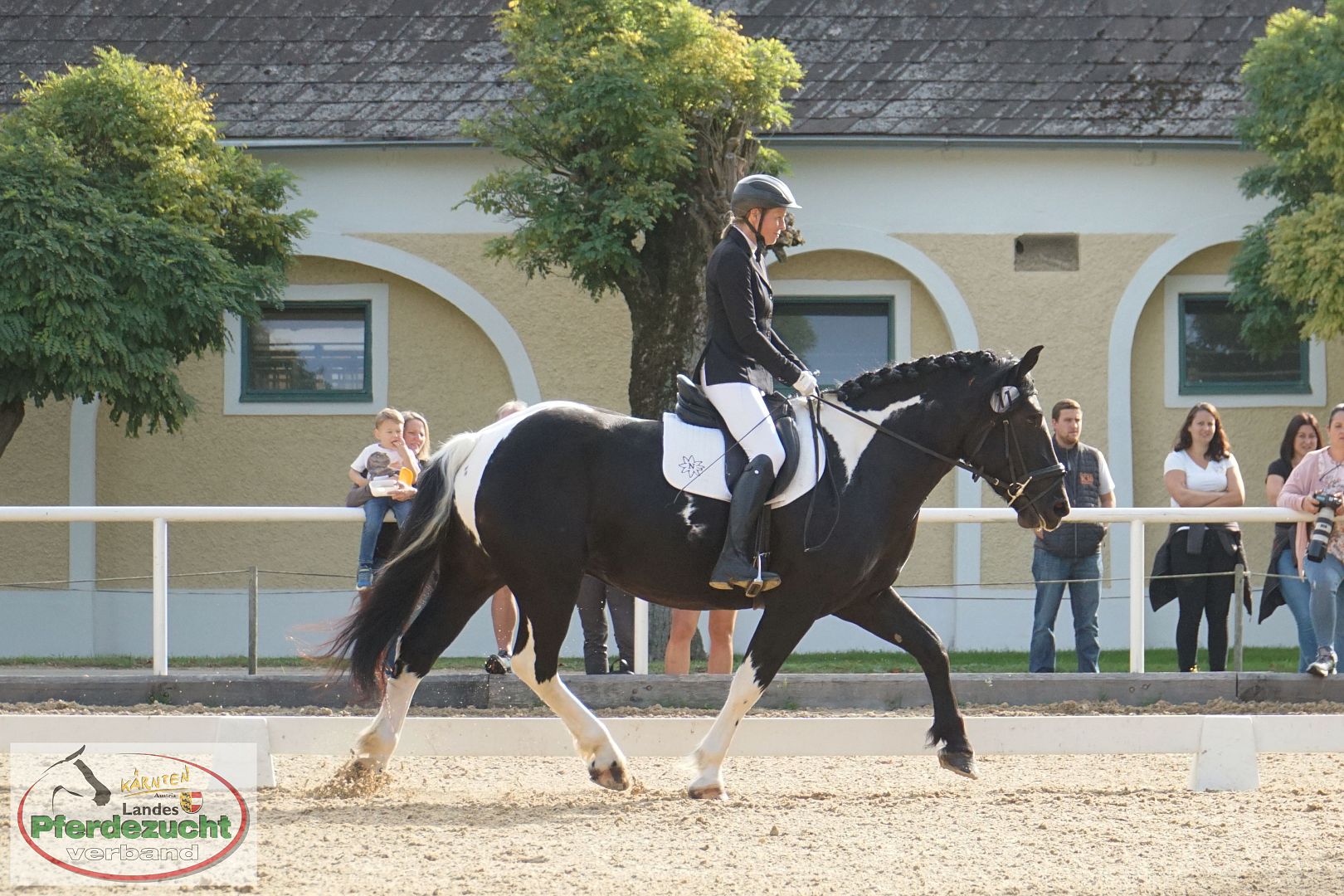 An die hervorragende zweite Stelle setzte sich die nächste Kärntnerin. Die Schwarzflecktigerstute Liesa gezogen nach Galvano Vulkan XV mit ihrer Reiterin Beate Wolf freuten sich an diesem Tag über eine rot-weiß-rote Schärpe. Liesa stammt aus der Zucht und steht im Besitz von Mag. Johann Wiedauf, Landskron und konnte ihre Reiterin an diesem Tag die Vorzüge, der mit viel Reitpferdepoints ausgestatteten Jungstute, bestens hervorheben. Sie zeigte sich in allen Kriterien sehr ausgeglichen und erhielt ebenfalls keine einzige Teilnote unter 8,0. Die beiden erreichten eine sehr gute Gesamtnote von 8,30.