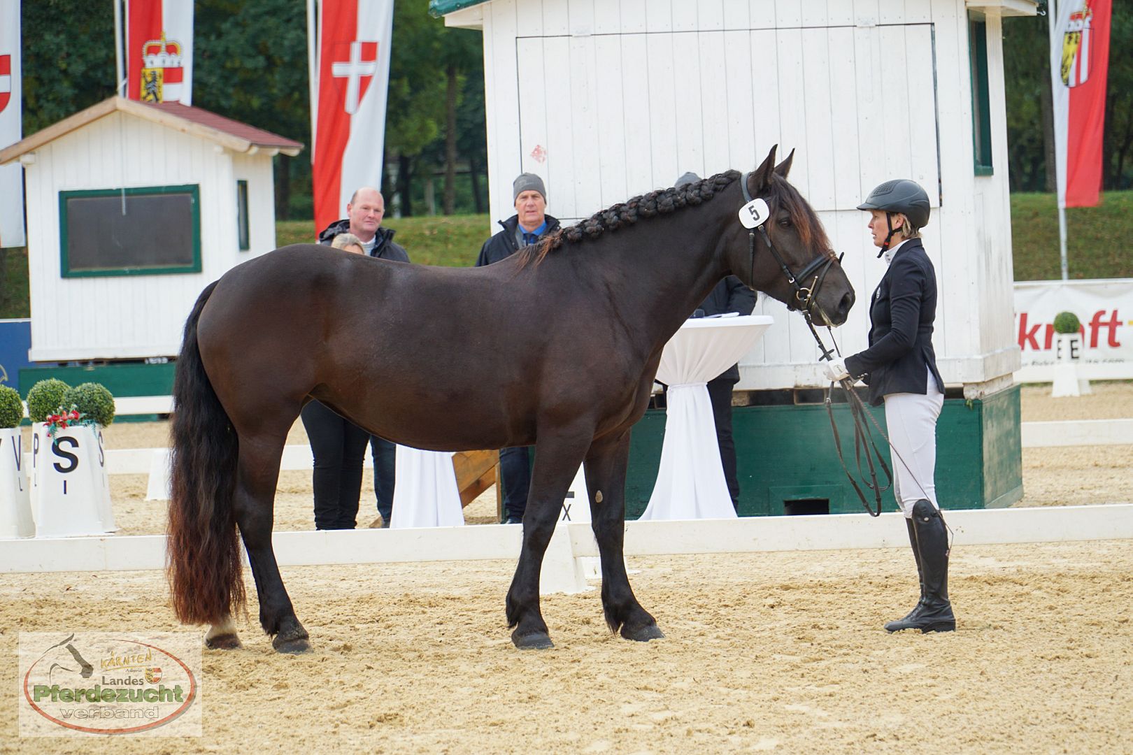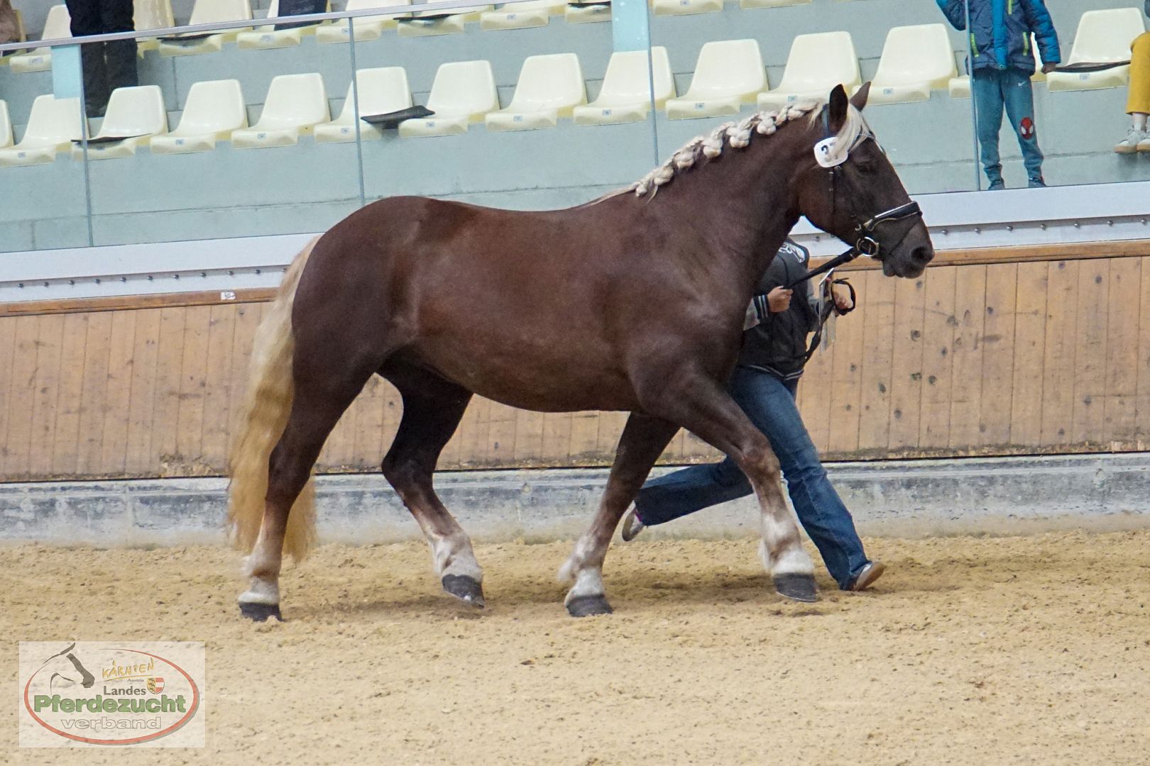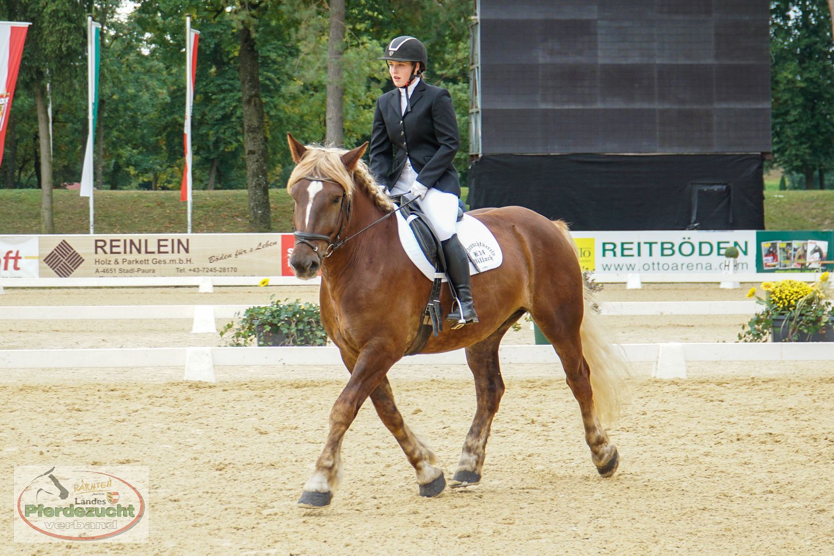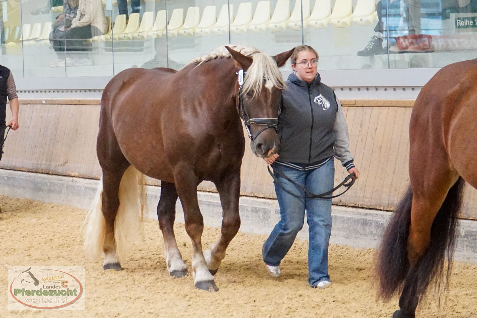 Den dritten Platz in dieser Klasse sicherte sich eine junge Stute aus Kärnten. Die Lehmfuchsstute Rabea nach Granat Diamant XVII aus der Verbandsprämienstute Ravenna nach Baron Nero XIV wurde gezüchtet und steht auch im Besitz von Silvia Gastager, Nötsch. Eindrucksvoll präsentiert wurde die rittige Stute von ihrer Tochter Alexandra Gastager. Für dieses harmonische Paar gab es nur Einzelnoten von 8,0 und mehr! Rabea präsentierte sich immer konzentriert und dafür gab es neben der 2. Bundesreservesiegerschärpe auch die gute Wertnote von 8,10.