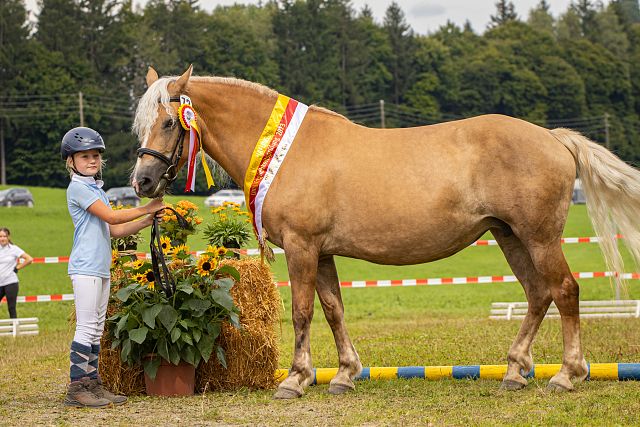 Die Siegerstute der 4. Umgänglichkeitsprüfung in Kärnten stammt aus der Zucht von Anne Nikolussi und steht im Besitz von Katrin Pichler-Plesin, Feistritz/G. Die Staatsprämien- und Elitezuchtstute Daya n. Winterstein ist natürlich für keinen Kärntner Haflingerzüchter eine Unbekannte. Die „Grand Dame“ wie sie liebevoll von ihrem langjährigen Besitzer Johann Plesin genannt wird, trat zu dieser Prüfung mit jemand ganz Besonderem an. Die erst siebenjährige Kristin Pichler stellte Daya mit einer solchen Perfektion und Ruhe vor, dass keines der Hindernisse für die Beiden ein Problem darstellte. Schlussendlich konnten sie die Prüfung mit einer ausgezeichneten Wertnote von 10,0 und somit der Höchstnote abschließen. Ein Paar, dass jedes Hindernis perfekt absolvieren konnte und den Inbegriff von Gelassenheit und bestem Interieur präsentierte.