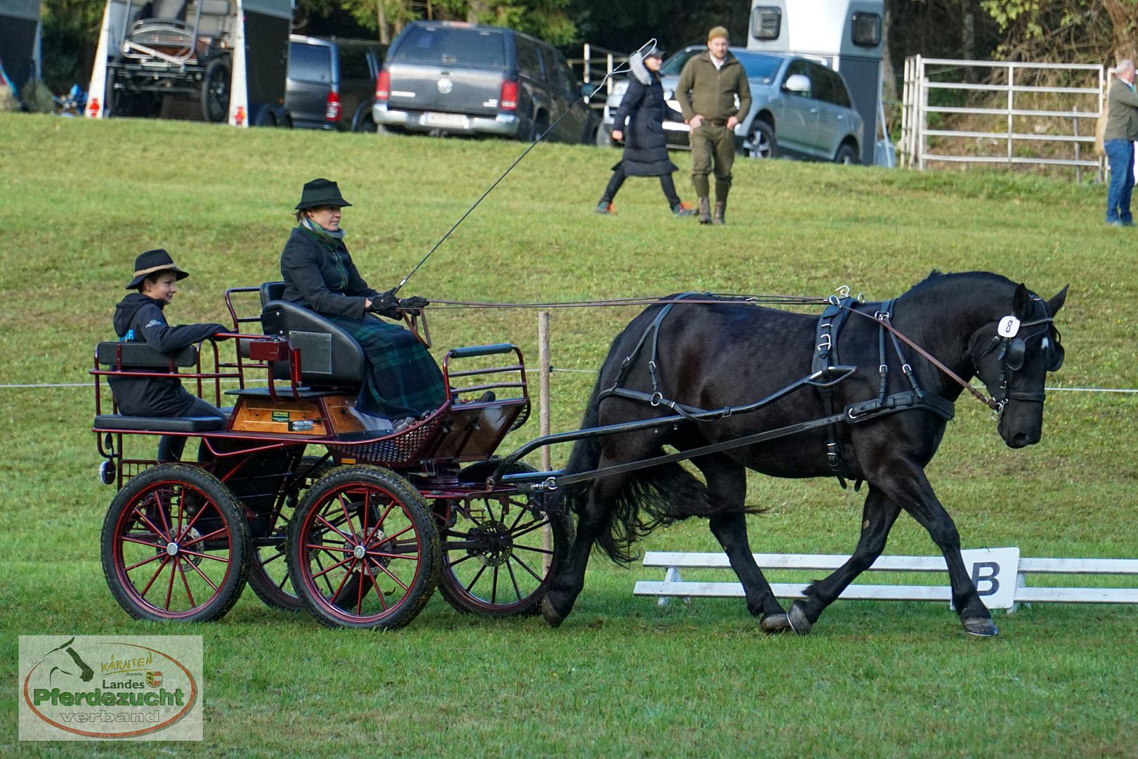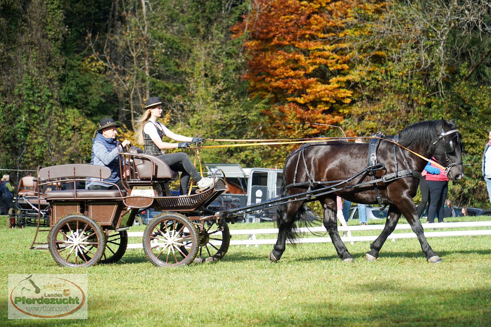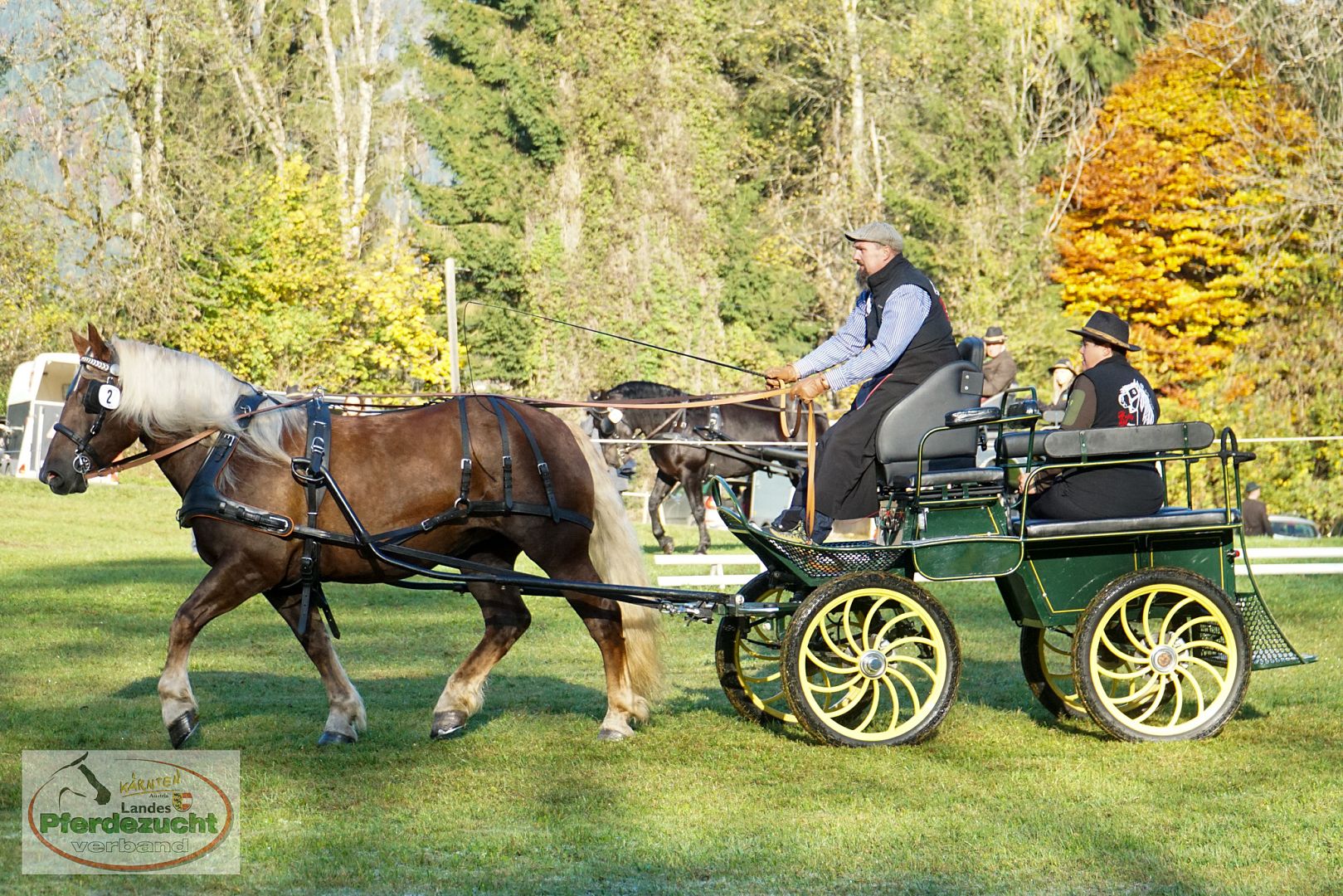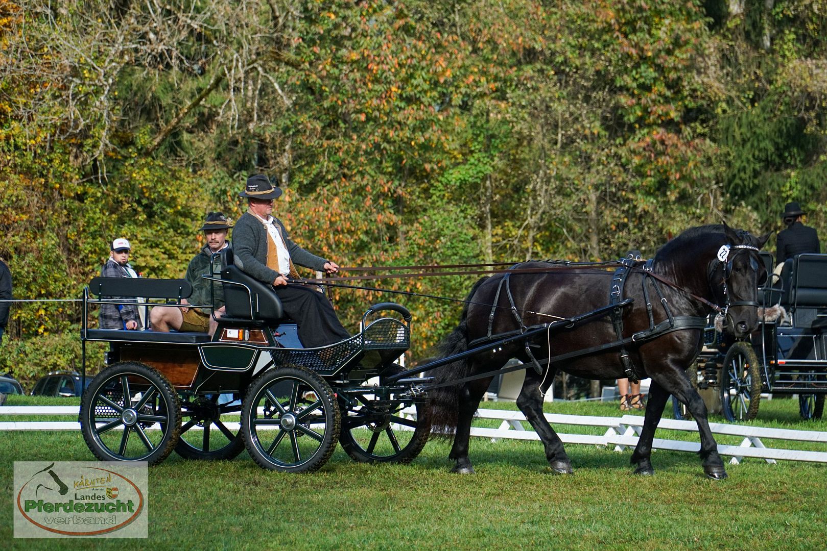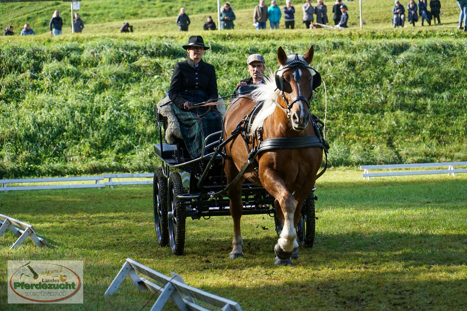 Die Siegerschärpe bei den Haflingern ging heuer ebenfalls nach Kötschach-Mauthen. Die BGM Burgstaller & Lamprecht absolvierte heuer mit ihren Pferden ein straffes und äußert erfolgreiches Programm. Den krönenden Abschluss schenkte ihnen aber ihre dreijährige Stute Lamina nach Prämienhengst Neugold aus der Lakrima gezogen. Die Landesschauteilnehmerin 2025 holte sich bei der heurigen Weltausstellung im Juni schon die Schauklasse 1a und bei der ARGE Haflinger Bundesjungstutenschau im September die Schauklasse 1b. Lamina stammt aus der Zucht von Werner Glantschnig, Obervellach und steht im Besitz der BGM Burgstaller und Lamprecht, Kötschach-Mauthen. Sie wurde von Marina Kalt sehr gut unter dem Sattel vorgestellt – vor allem die Rittigkeit dieser Stute wurde hervorgehoben. Eindrucksvoll war aber auch die Präsentation vor der Kutsche, am Kutschbock Peter Ladstätter. Mit viel Aufrichtung, Fleiß und sehr schwungvoll zeigt sie sich hier. Mit dieser Vorstellung erreichte dieses Team die Höchstnote an diesem Tag – 8,64. Arbeitswillig, gelehrig und nervenstark – eine würdige Siegerstute.