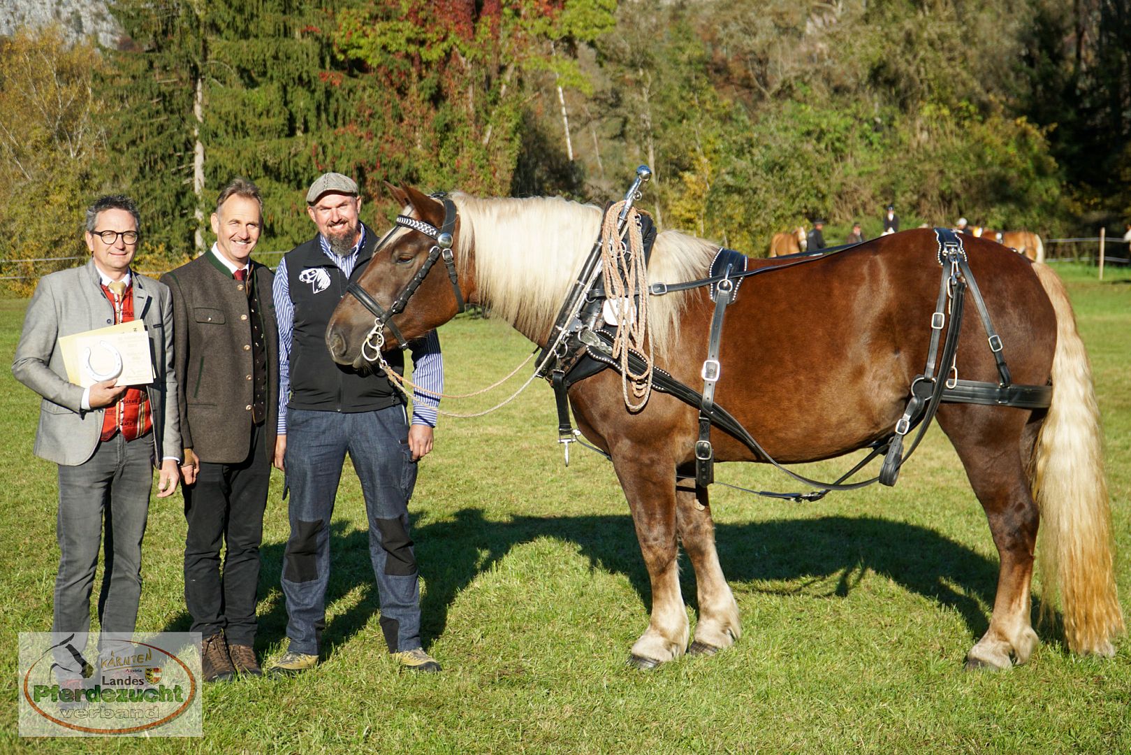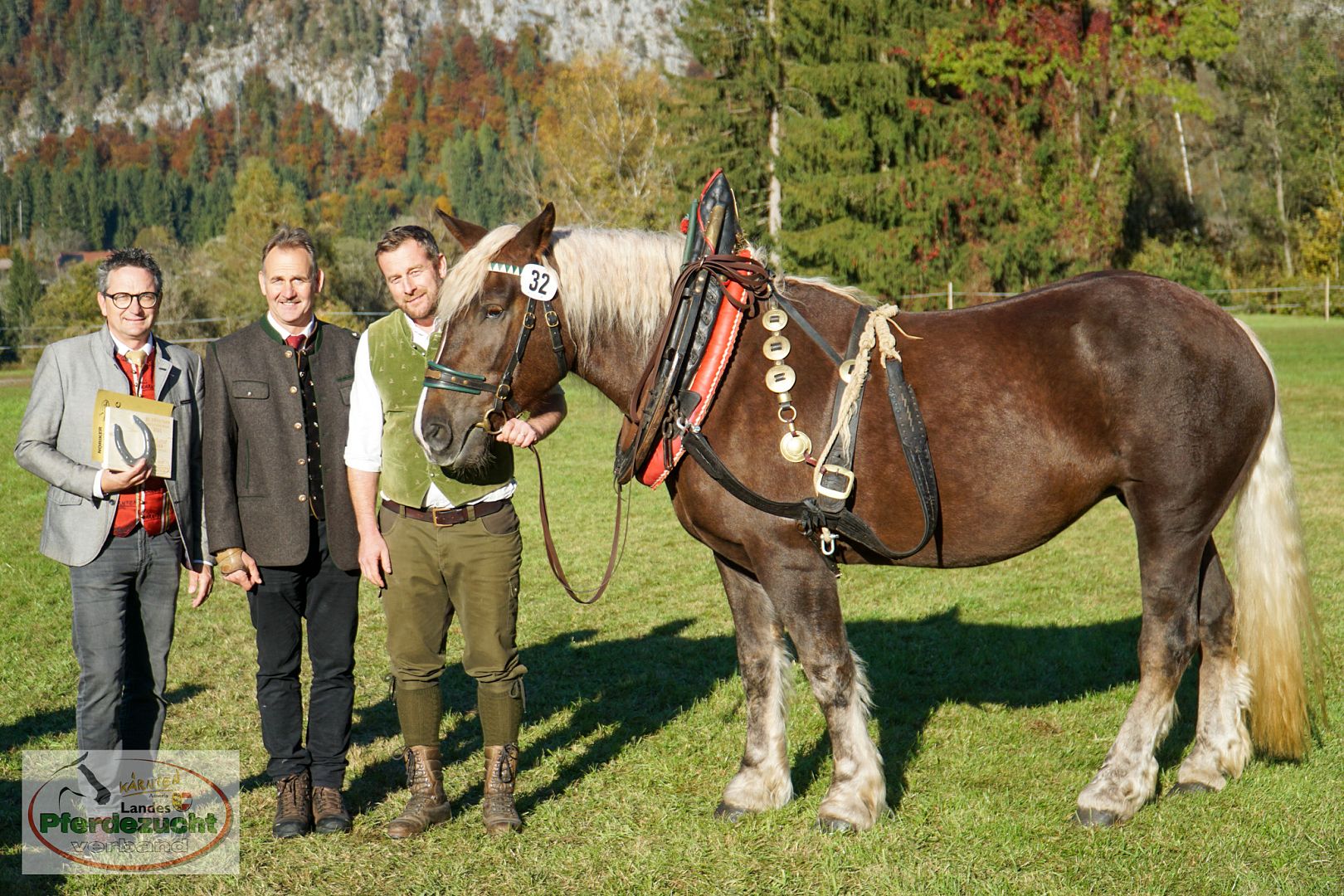 Den verdienten Tagessieg holte sich auch heuer wieder eine Fuchsstute. Die Landesschauteilnehmerin 2025 Lanz-Svenja wurde gezüchtet von der BGM Luser, Kötschach-Mauthen und steht nun im Besitz von Josef Luser, Kötschach-Mauthen. Die Tochter der Soreia, gezogen nach Lorenzo Nero XIV wurde hervorragend von Pferdeführerin und Fahrerin Katharina Zankl präsentiert. Diese leistungsbereite Jungstute zeigte sich in allen Teilbereichen von ihrer besten Seite. Die beiden glänzten vor allem beim Schwachholziehen und bei der Einspännerfahrprüfung. Hier erreichten sie ausschließlich Noten über 8,5. Eine Stute mit einem außergewöhnlich gelassenen Nervenkostüm, aufmerksam und immer ganz bei ihrer Pferdeführerin. Dieses Vertrauensverhältnis und die Grundqualität verhalfen diesem eingespielten Team zum Tagessieg und zur Siegerschärpe mit der sehr guten Tageshöchstnote von 8,75!