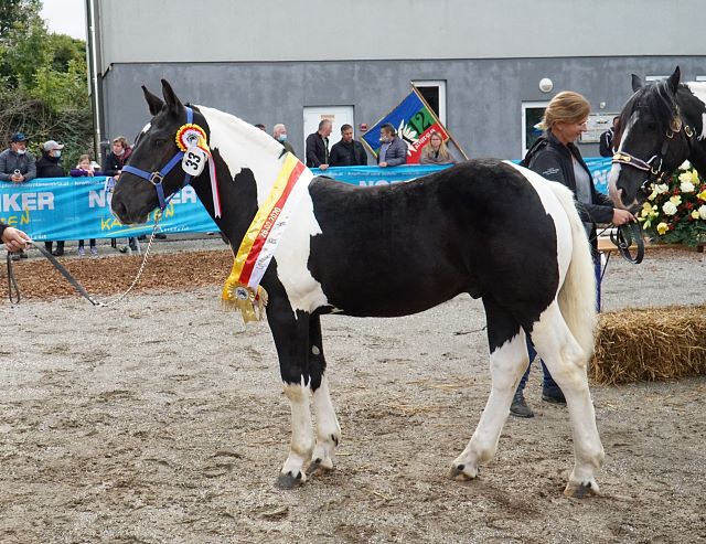 Den Landessieg bei den Hengstfohlen sicherte sich ein Hengstfohlen aus der Zucht und im Besitz von Erwin Tschapeller aus Reisach. Der überaus typvolle, maskuline, wunderschön gescheckte Sohn des Shakespeare Vulkan XIX a. d. Mirabell n. Wild Nero XIV überzeugt mit einem sehr guten Seitenaufriss und viel Ausdruck. Er ist auch der Vollbruder der letztjährigen Landessiegerin bei den Stutfohlen. Eine Anpaarung die für Qualität spricht.