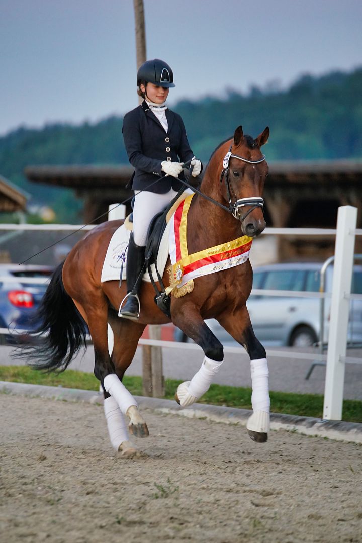 Bei den vierjährigen Reitpferden setzte sich eine ganz besondere Stute ganz an die Spitze. Die Fuchsstute Élysée nach Escolar über Licotus/Don Gregory StPrH. gezogen überzeugte die Kommission in allen Einzelkriterien. Élysée aus der Zucht und im Besitz von Christian Schumach wurde unter dem Sattel perfekt vorgestellt von Stephanie Dearing und erhielt durchwegs Noten von 8,0 und mehr. Sehr rittig zeigte sie sich stets aufmerksam und immer gewillt die ihr gestellten Aufgaben bestmöglich zu absolvieren. Im Gesamteindruck gab es sogar die Note 9,5! Für die schöne Vorstellung erhielt dieses Paar die hervorragende Wertnote von 8,5 und eine Siegerschärpe.