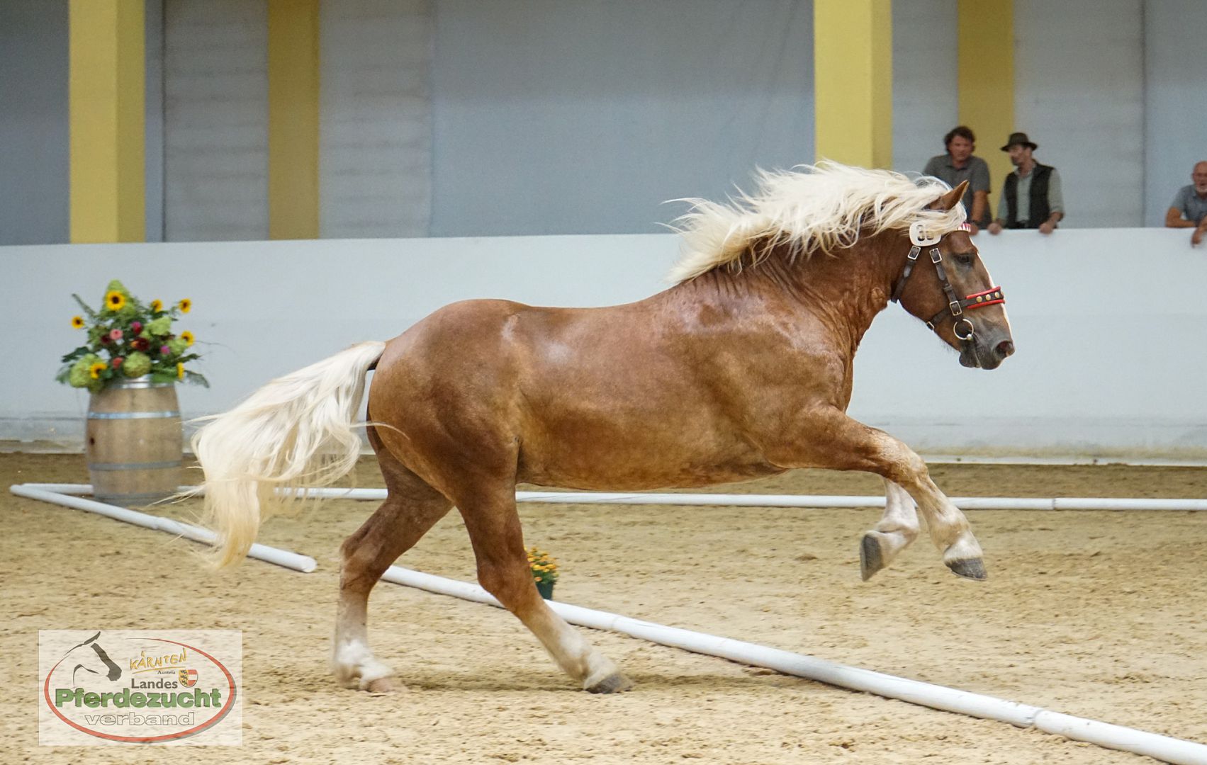 ein Fuchshengst mit kräftigem Fundament, guter Aufmachung und rahmigen Seitenbild. Der typvolle und ausdruckstarke Junghengst ist väterlicherseits nach Prinz Vulkan XVIII und mütterlicherseits aus der Senta nach Galileo Diamant XV und Berghall Nero XIV gezogen. Er überzeugte die Kommission mit einer überragenden Trabbewegung im Freilauf. Mit guter Bergauftendenz, viel Raumgriff, sehr gutem Schub aus der Hinterhand, guter Schulterfreiheit und viel Schwebephase ist seine Trabbewegung ausgestattet. Züchter ist Niko Zwitter aus Achomitz. Besitzer ist ebenfalls der LPZV Kärnten. Mit einer Wertnote von 7,64 und den Maßen 163/174/206/24,5 wurde er in das Testhengstbuch eingetragen. Polka Vulkan XIX wird auf der Deckstation Katharina Zankl in Labientschach aufgestellt.