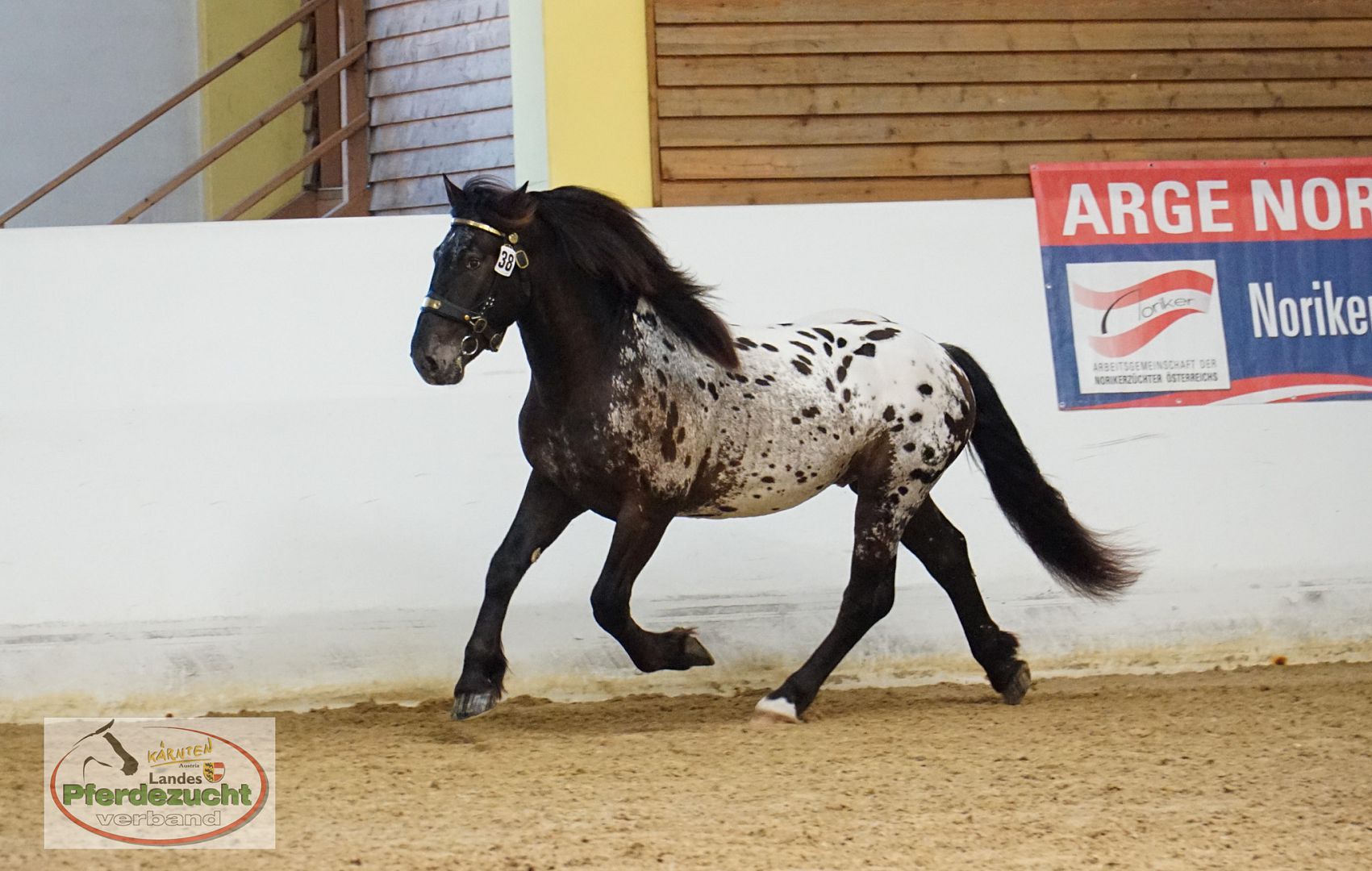 Ein Schwarzflecktigerhengst aus der Zucht von Peter Brenndörfer aus Thörl-Maglern. Besitzer ist Klaus Kreuter aus Oberwölz. Gezogen nach Galvano Vulkan XV aus der Lucy nach PrH Hiasen Schaunitz XVI. Dieser im mittleren Rahmen stehende, mit guter Linie ausgestattete Junghengst überzeugte mit einem kräftigen Fundament und durch gute Körperverbindungen. Im Schritt zeigte er sich gut gelassenen, die Trabbewegung war bergaufgerichtet sowie mit genügend Raumgriff ausgestattet. Die Maße sind 162/172/196/23,5 und er wurde mit einer Wertnote von 7,73 Punkten gekört.