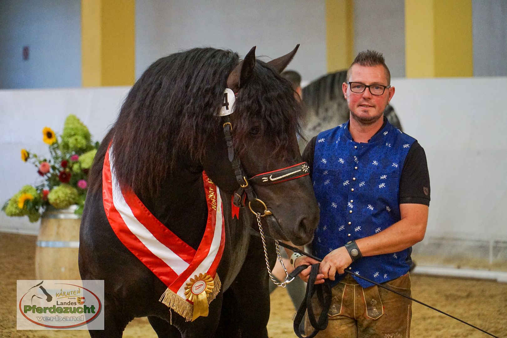 Der formschöne, mit viel Adel ausgestattete Rapphengst überzeugte durch guten Rasse- und Geschlechtstyp, mit einem ausdrucksstarken Kopf, einem harmonischen, gut proportionierten Gebäude und einem korrekten Fundament. Im Schritt zeigte er sich fleißig und taktsicher mit viel Raumgriff, der Trab ist mit guter Elastizität und gutem Schub ausgestattet. Sein Vater ist PrH. Elsass Nero XIV und die Mutter, Fortuna, ist nach PrH Edelweiß Nero XII und Vento Vulkan XV gezogen. Stolze Züchterin ist Elisabeth Kandutsch, vlg. Truden, aus Hohenthurn und Besitzer der LPZV Kärnten. Seine Maße sind 162/172/199/24. Der mit einer Wertnote von 7,82 platzierte 2. Körungsreservesieger wird auf der Deckstation Christian Steindl in Fresach zum Deckeinsatz kommen.