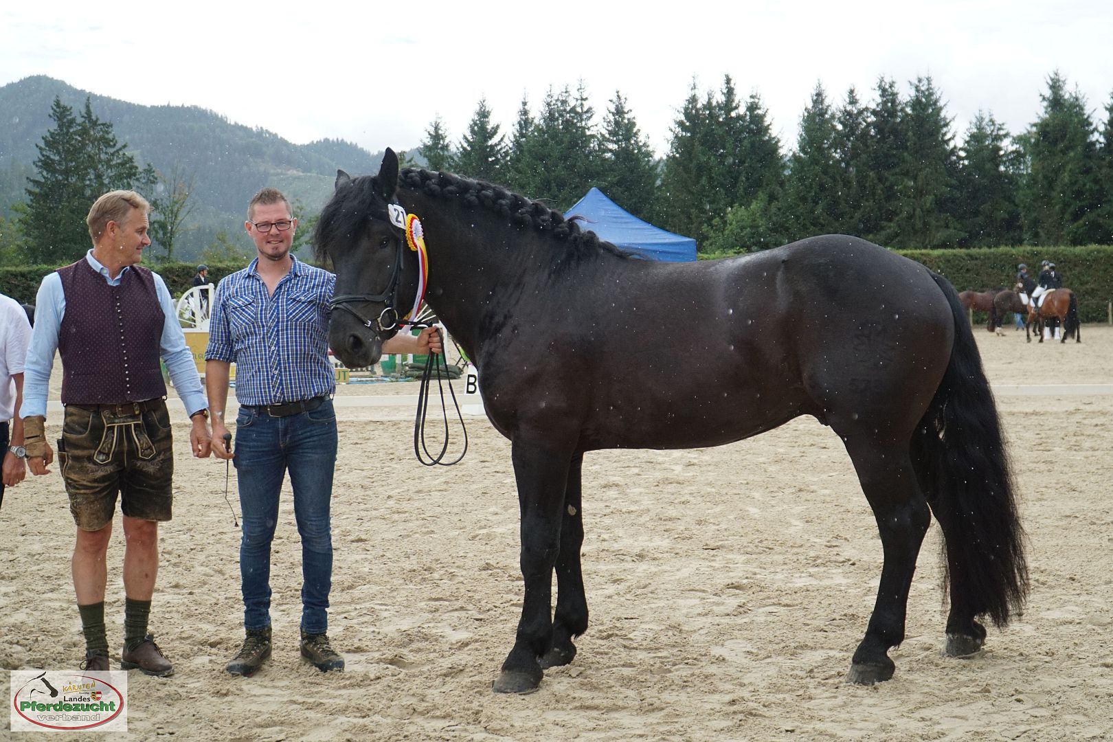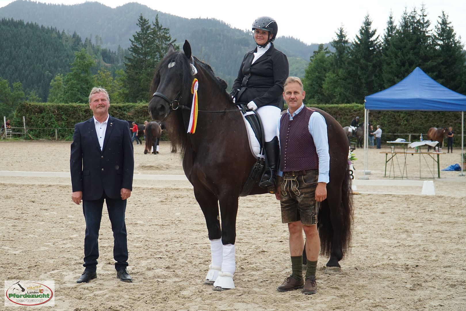 An die zweite Stelle platzierte sich die Rappstute Baronesse – Estelle nach Elsass Nero XIV aus der Zucht und im Besitz von Michaela & Bernhard Striedner, Görtschach. Sie wurde unter dem Sattel vorgestellt von Viktoria Wiedenig und zeigte sich stets fleißig mit gutem Schwung und gutem Raumgriff. Die Stärke dieser rittigen Jungstute ist die Ausgeglichenheit in allen Teilkriterien. Die beiden wurden für ihre harmonische Vorstellung mit der guten Wertnote von 8,04 und der Reservesiegerschärpe belohnt.